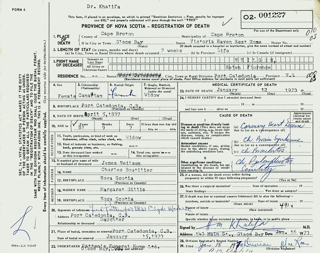 1. PLACE OF DEATH County of Cape Breton If in City or Town Glace Bay