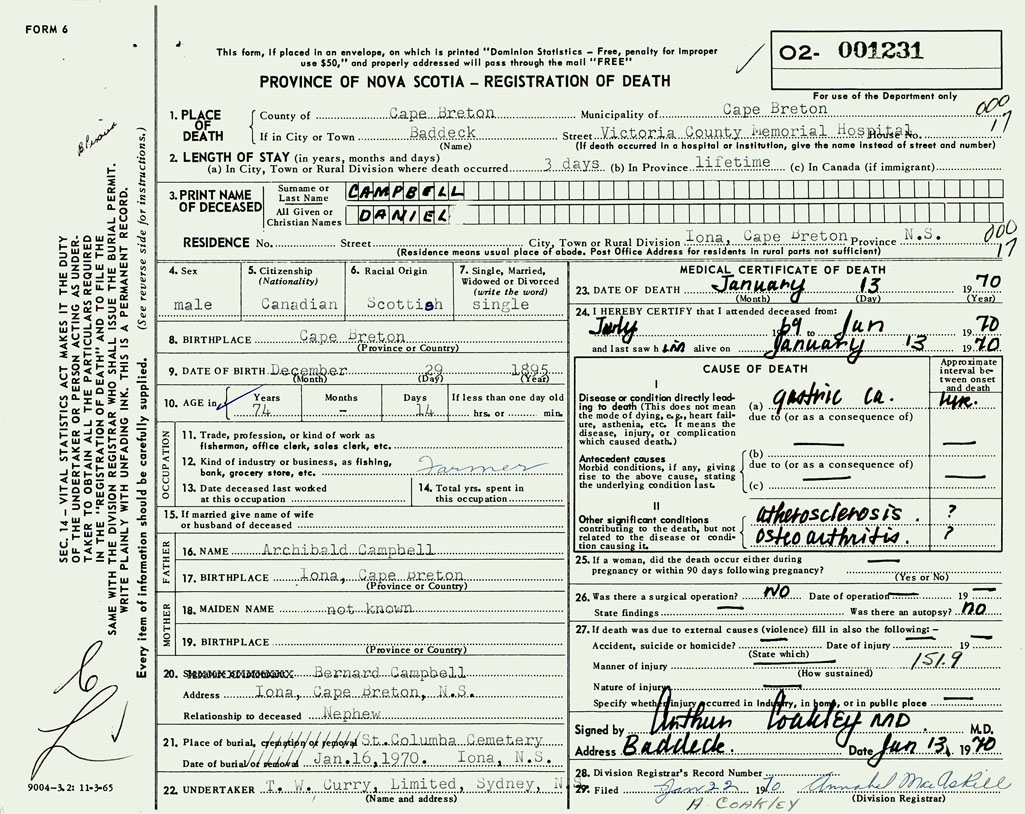 1. PLACE OF DEATH County of Victoria If in City or Town Baddeck
