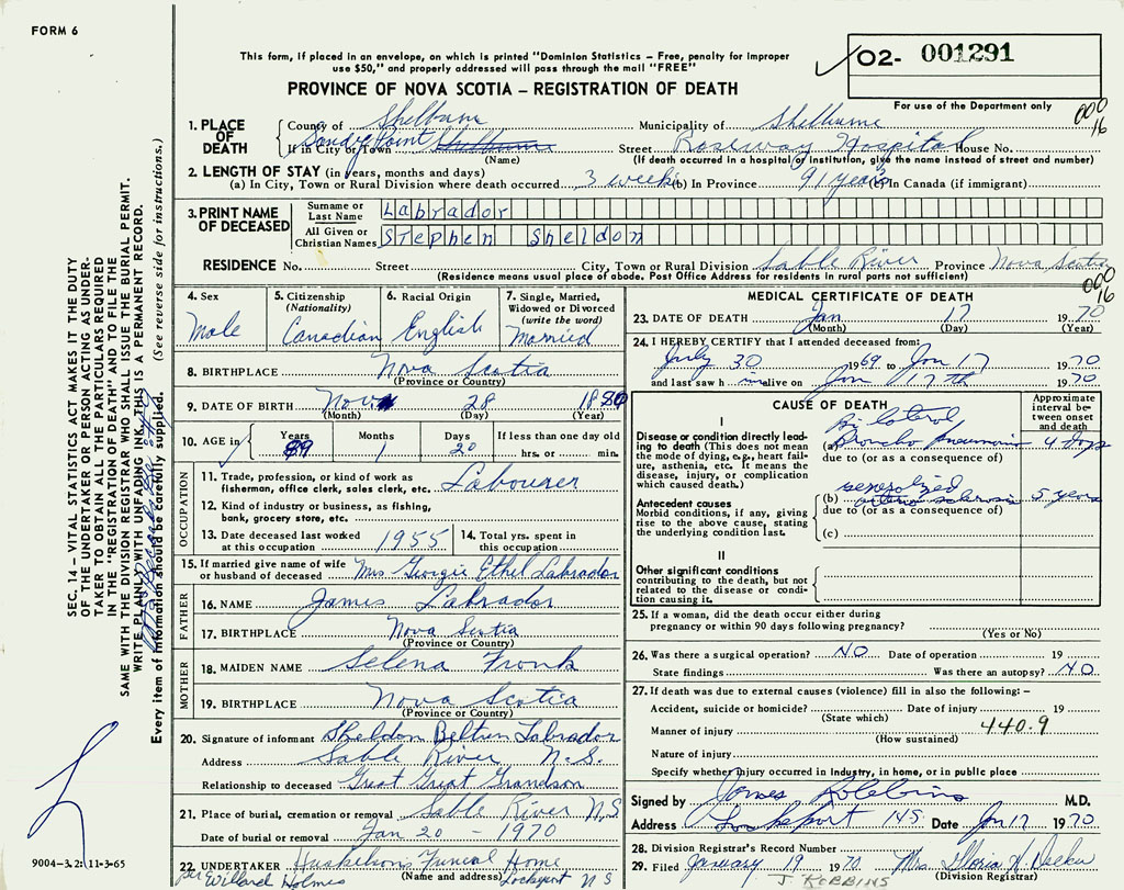 1. PLACE OF DEATH County of Shelburne If in City or Town Sandy Point