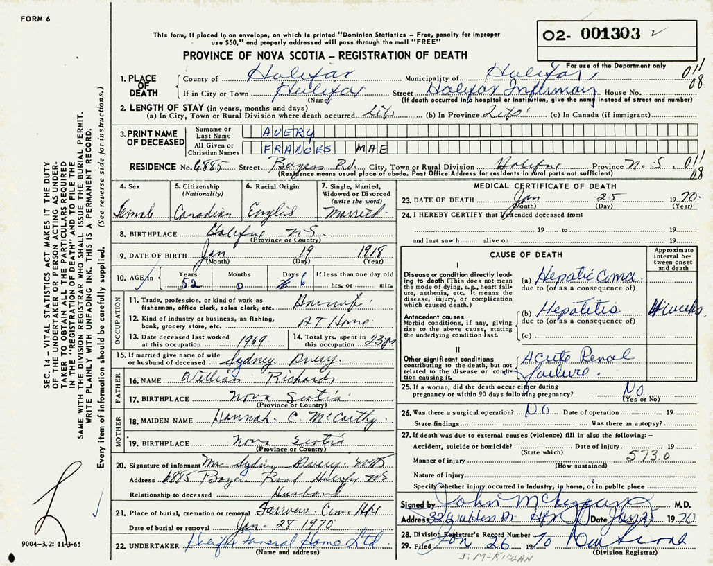 PROVINCE OF NOVA SCOTIA — REGISTRATION OF DEATH