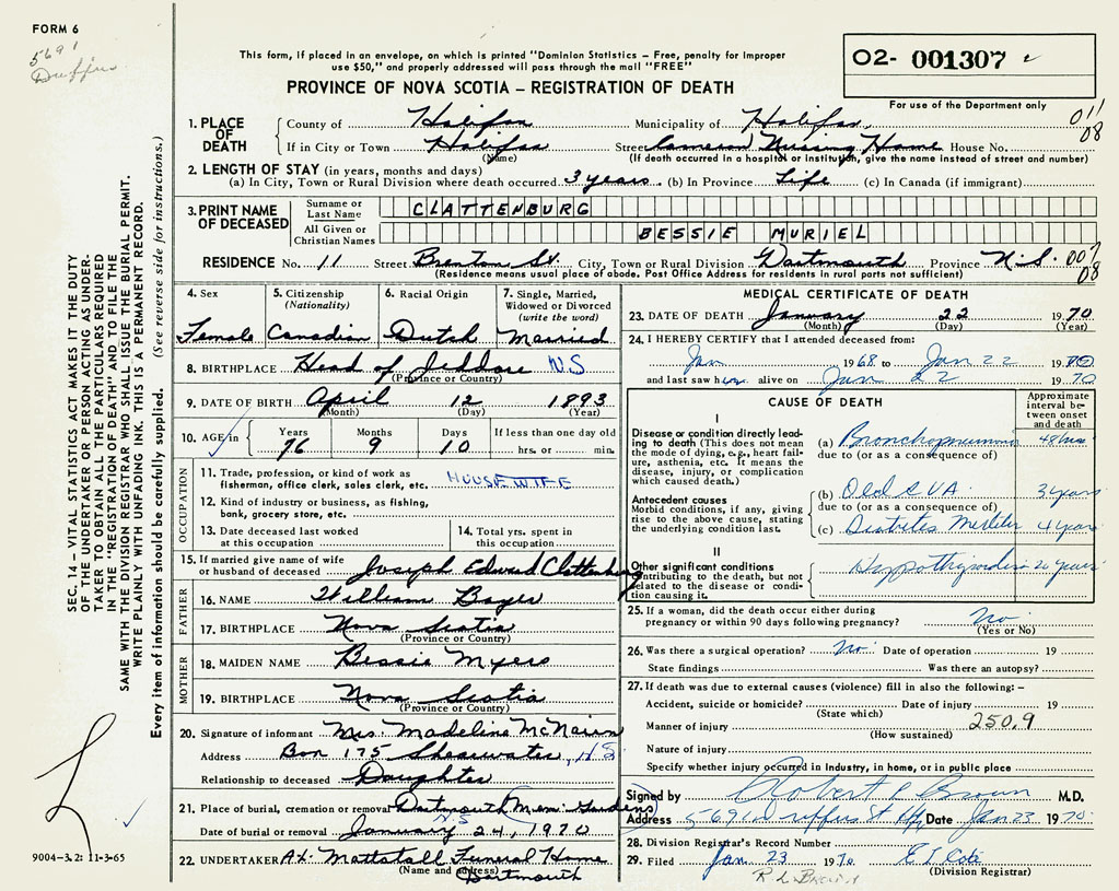 PROVINCE OF NOVA SCOTIA — REGISTRATION OF DEATH
