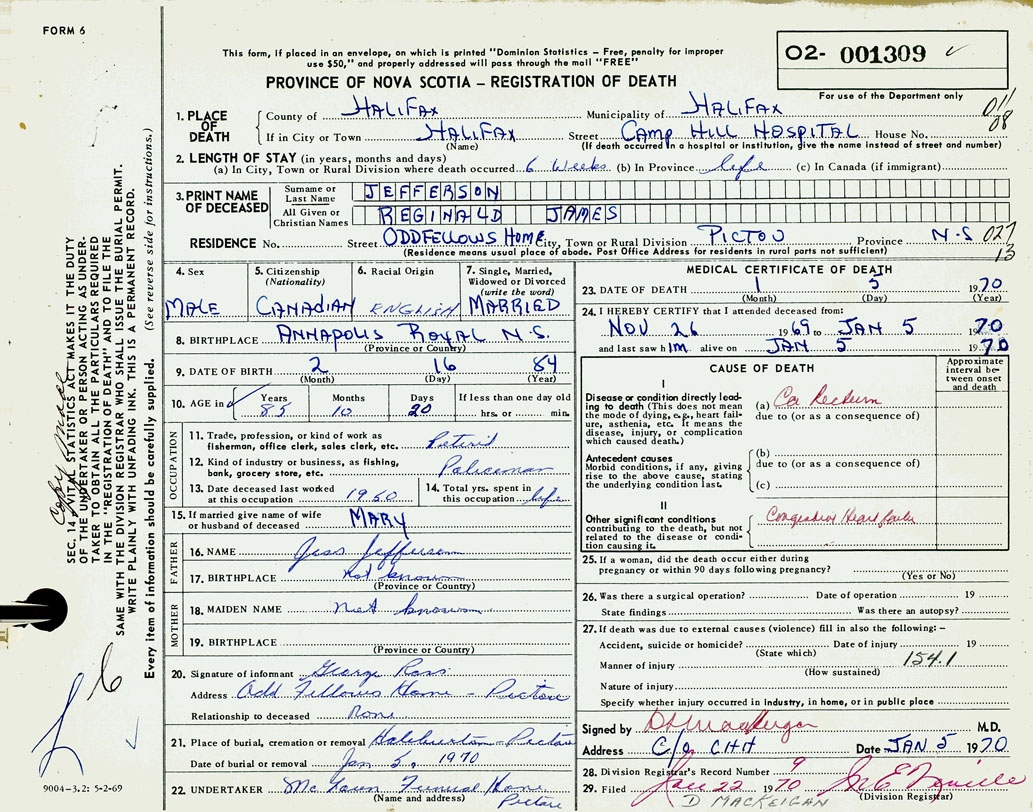 PROVINCE OF NOVA SCOTIA — REGISTRATION OF DEATH