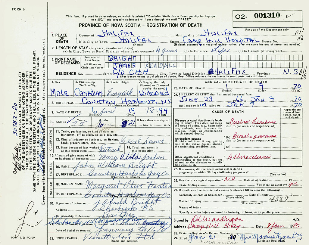 PROVINCE OF NOVA SCOTIA — REGISTRATION OF DEATH