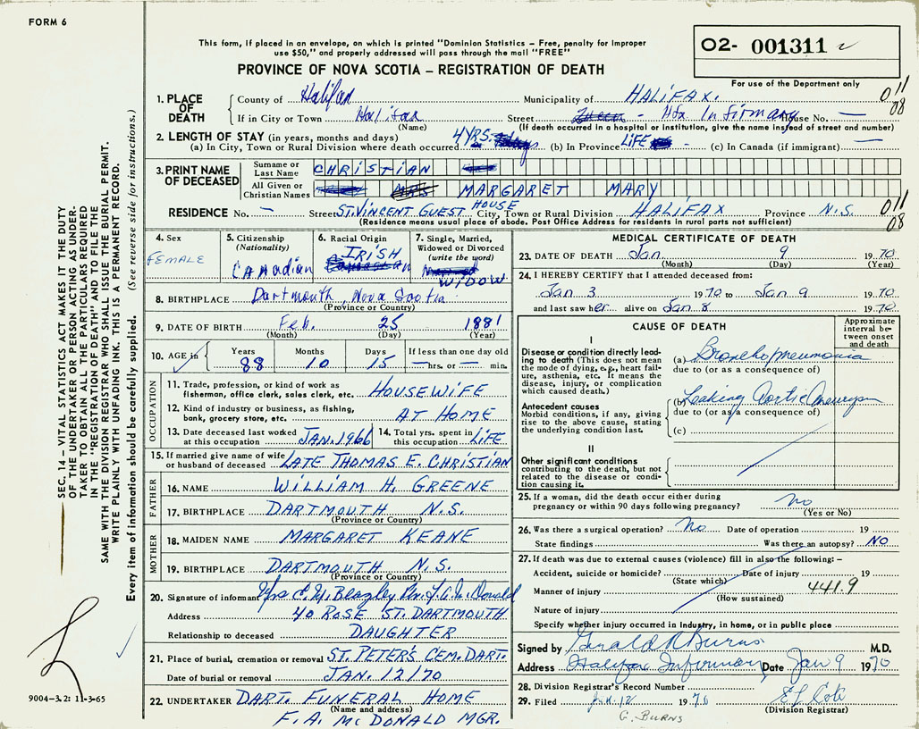 PROVINCE OF NOVA SCOTIA — REGISTRATION OF DEATH