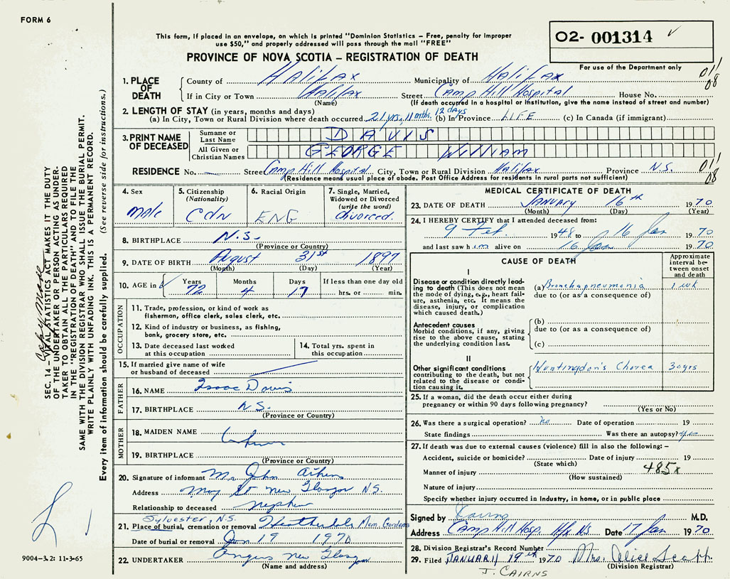 PROVINCE OF NOVA SCOTIA — REGISTRATION OF DEATH