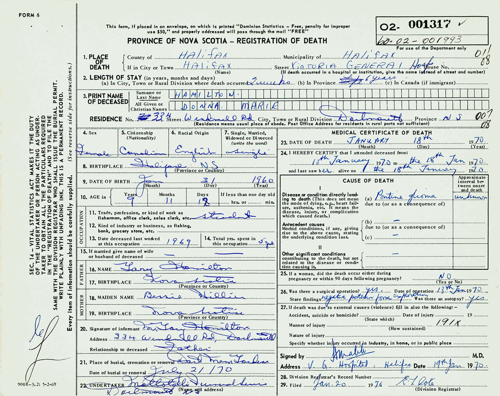 PROVINCE OF NOVA SCOTIA — REGISTRATION OF DEATH