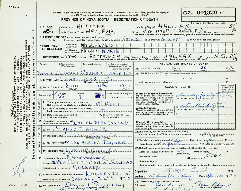 PROVINCE OF NOVA SCOTIA — REGISTRATION OF DEATH