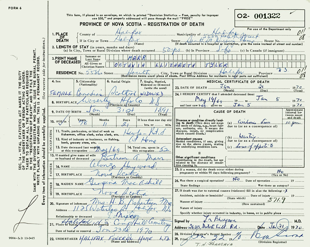 PROVINCE OF NOVA SCOTIA — REGISTRATION OF DEATH