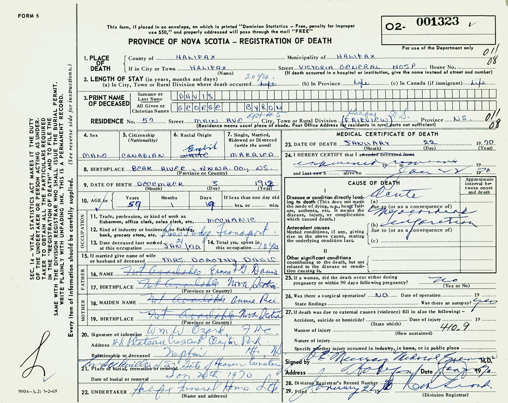 PROVINCE OF NOVA SCOTIA — REGISTRATION OF DEATH