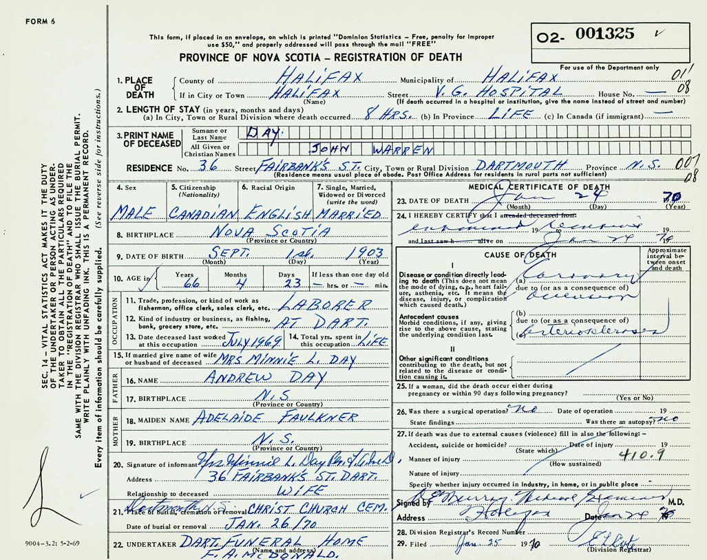 PROVINCE OF NOVA SCOTIA — REGISTRATION OF DEATH