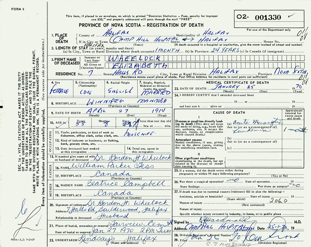 PROVINCE OF NOVA SCOTIA — REGISTRATION OF DEATH