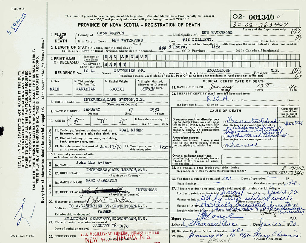 1. PLACE OF DEATH County of Cape Breton If in City or Town New Waterford