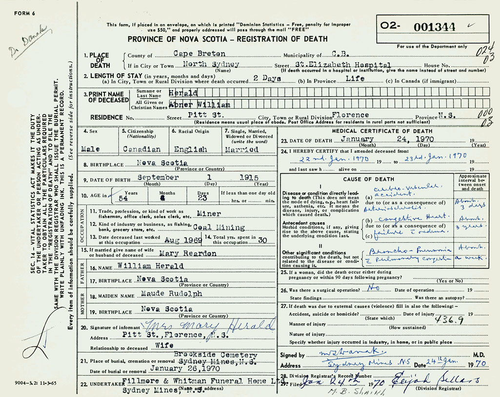 21. Place of burial Brookside Cemetery, Sydney Mines