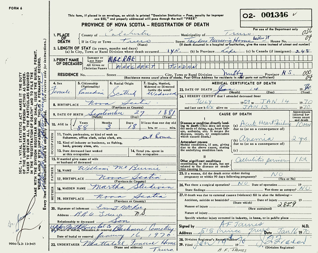 PROVINCE OF NOVA SCOTIA — REGISTRATION OF DEATH