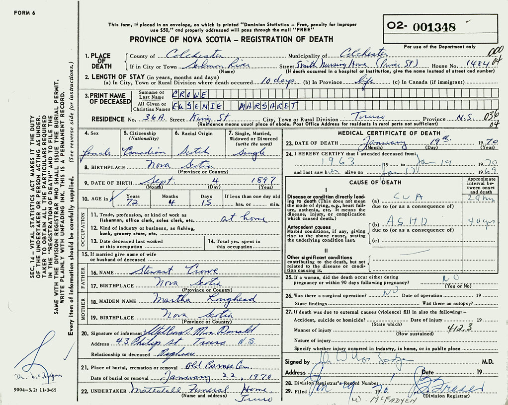 PROVINCE OF NOVA SCOTIA — REGISTRATION OF DEATH