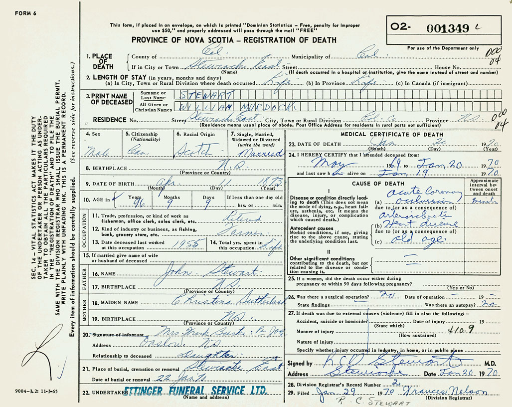 PROVINCE OF NOVA SCOTIA — REGISTRATION OF DEATH