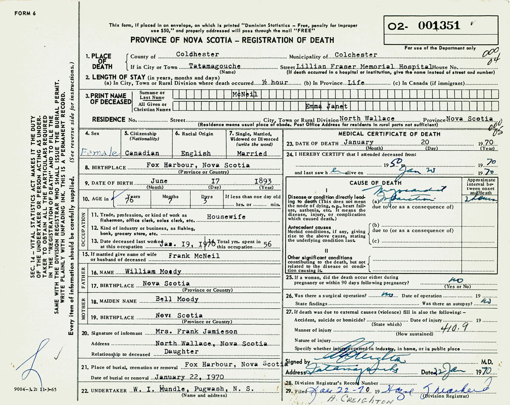 1. PLACE OF DEATH County of Colchester If in City or Town Tatamagouche