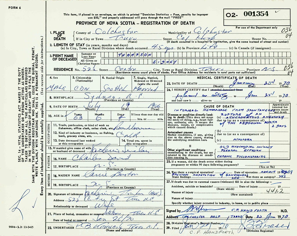 PROVINCE OF NOVA SCOTIA — REGISTRATION OF DEATH