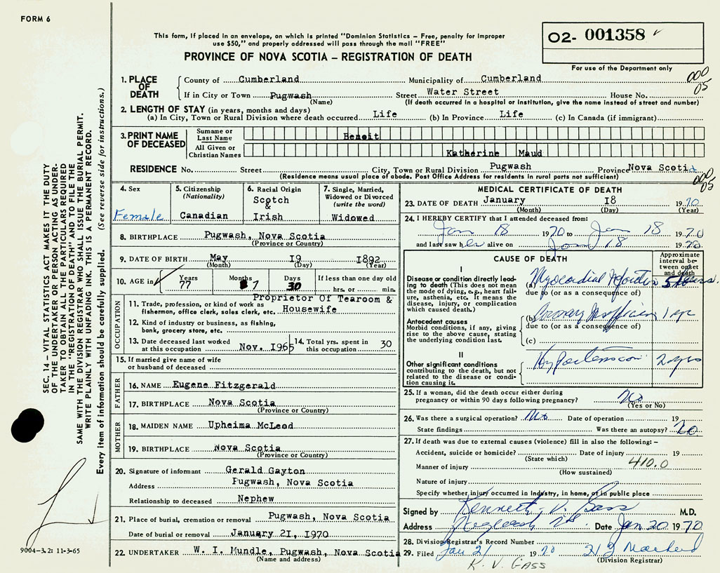1. PLACE OF DEATH County of Cumberland If in City or Town Pugwash