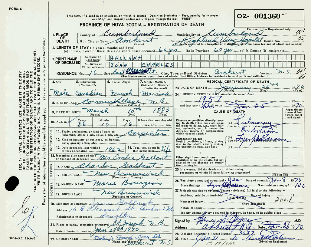 PROVINCE OF NOVA SCOTIA — REGISTRATION OF DEATH