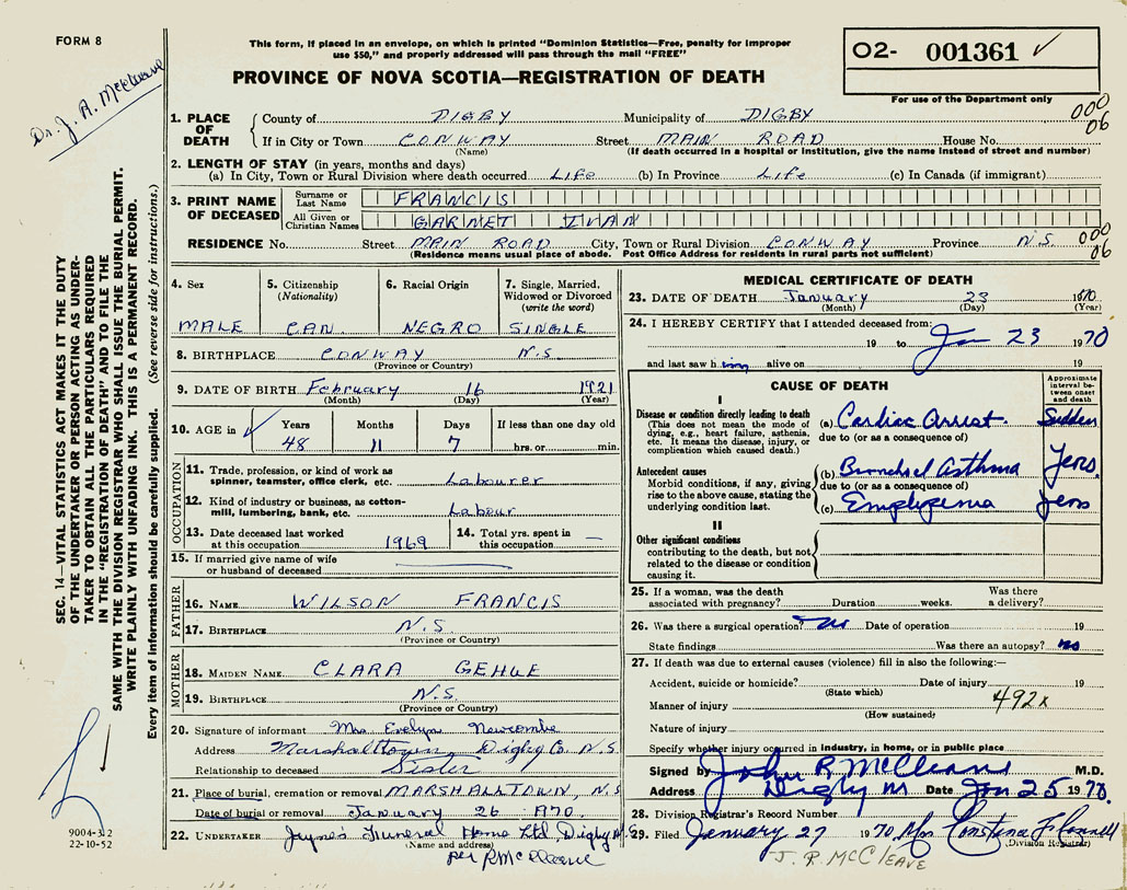 PROVINCE OF NOVA SCOTIA — REGISTRATION OF DEATH