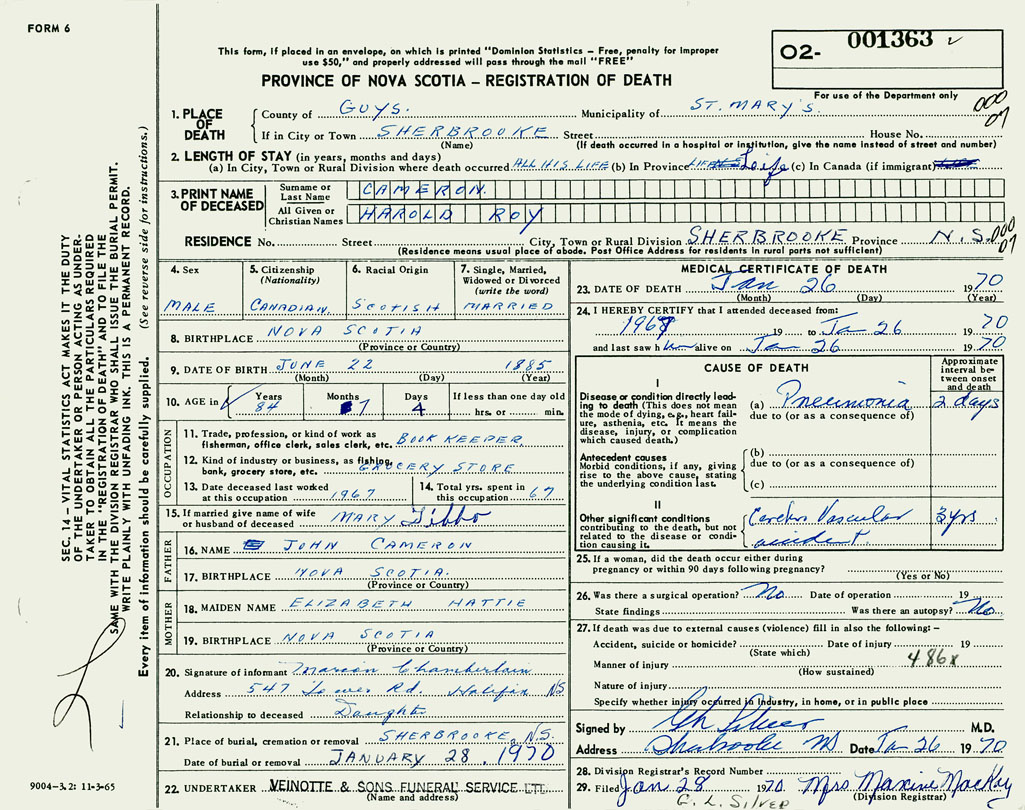 PROVINCE OF NOVA SCOTIA — REGISTRATION OF DEATH