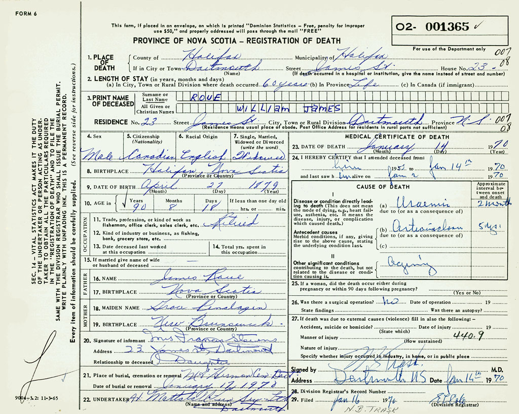 PROVINCE OF NOVA SCOTIA — REGISTRATION OF DEATH