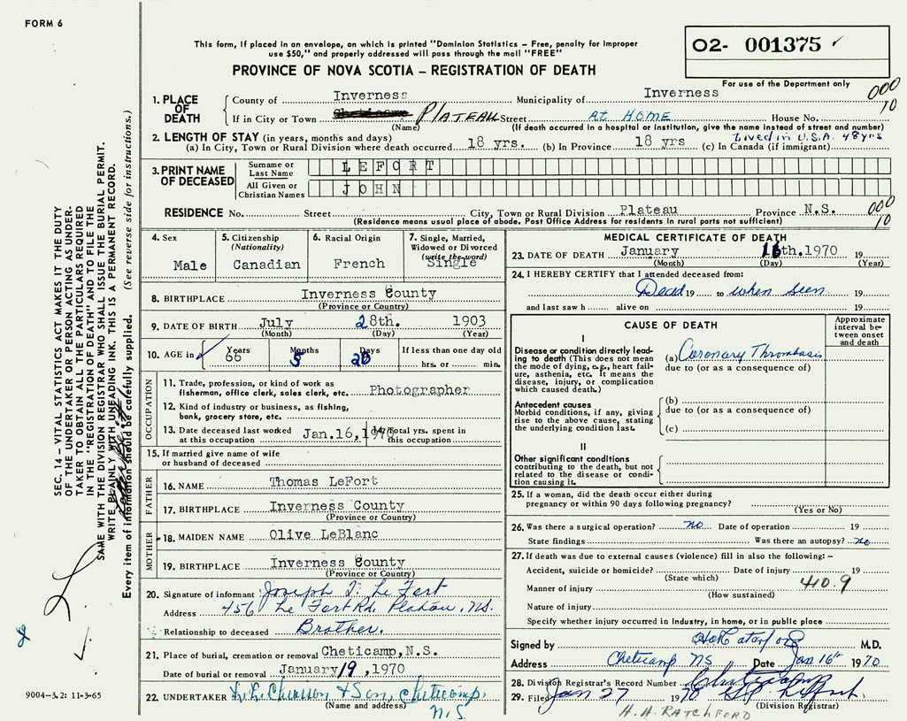 PROVINCE OF NOVA SCOTIA — REGISTRATION OF DEATH