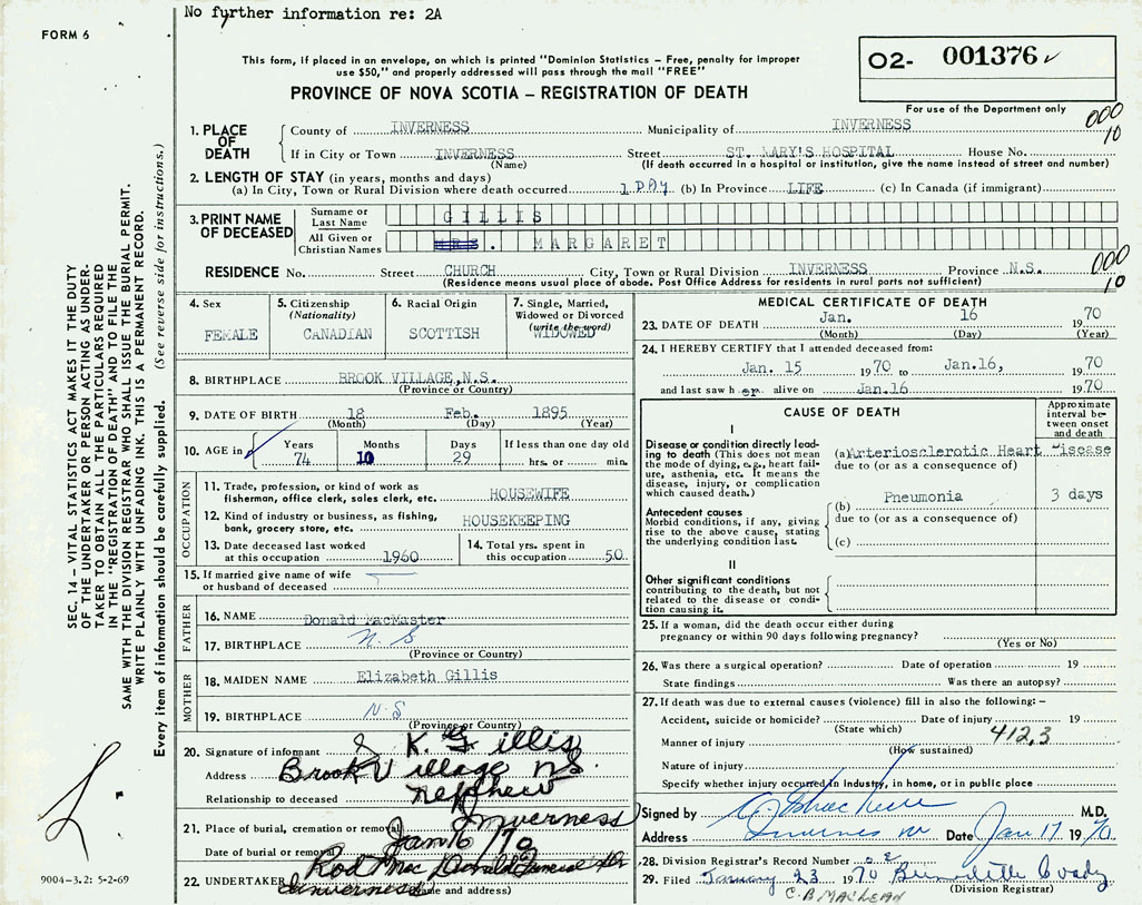 PROVINCE OF NOVA SCOTIA — REGISTRATION OF DEATH