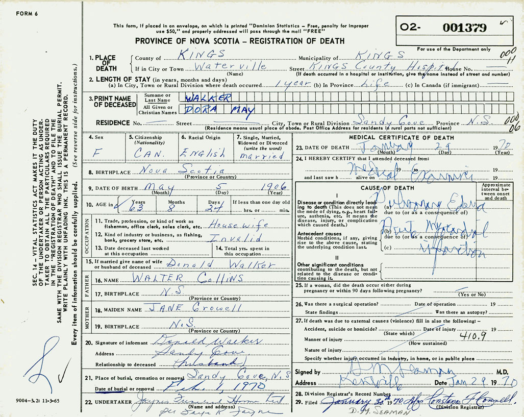 PROVINCE OF NOVA SCOTIA — REGISTRATION OF DEATH