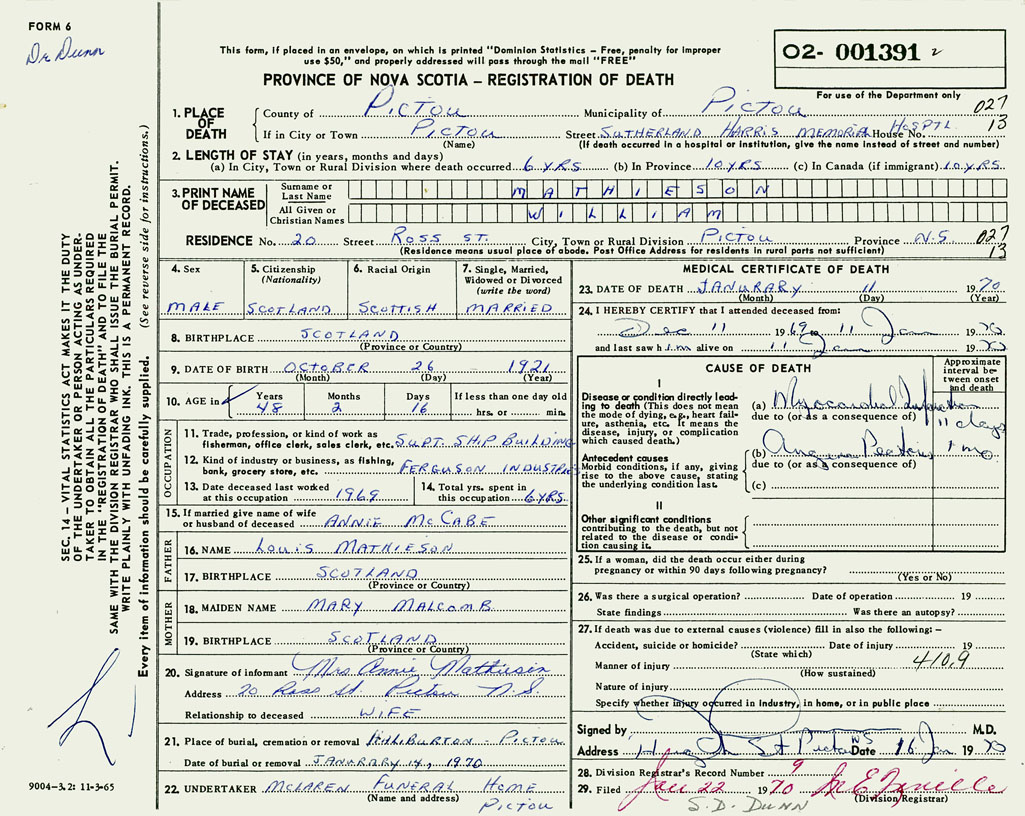 1. PLACE OF DEATH County of Pictou If in City or Town Pictou
