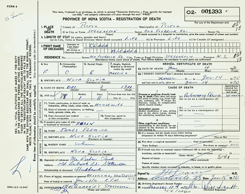 1. PLACE OF DEATH County of Pictou If in City or Town Old Foxbrook Rd, Stellarton