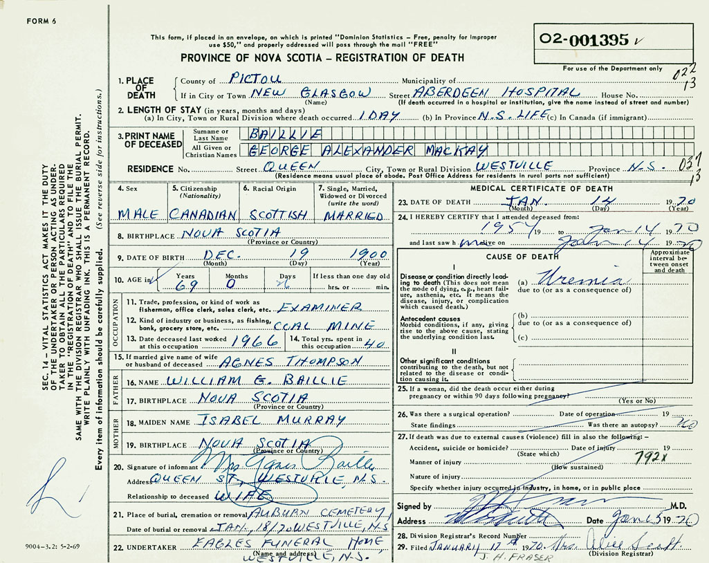 1. PLACE OF DEATH County of Pictou If in City or Town New Glasgow