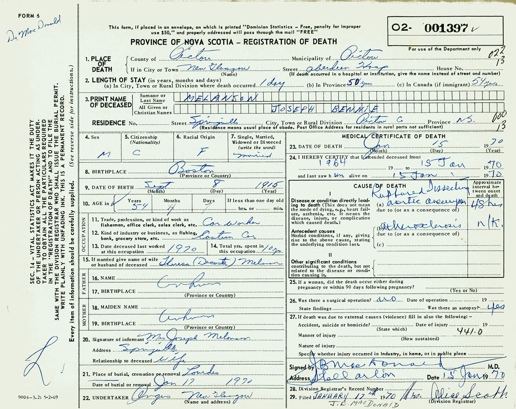 PROVINCE OF NOVA SCOTIA — REGISTRATION OF DEATH