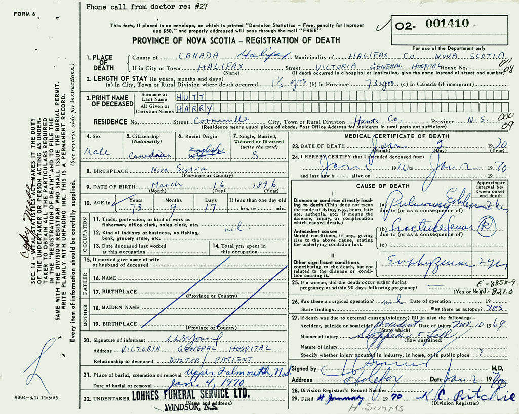 PROVINCE OF NOVA SCOTIA — REGISTRATION OF DEATH