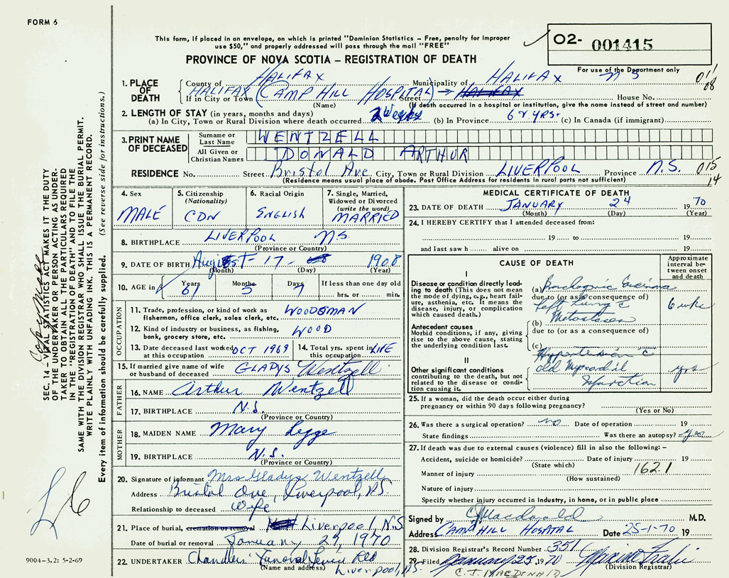 PROVINCE OF NOVA SCOTIA — REGISTRATION OF DEATH