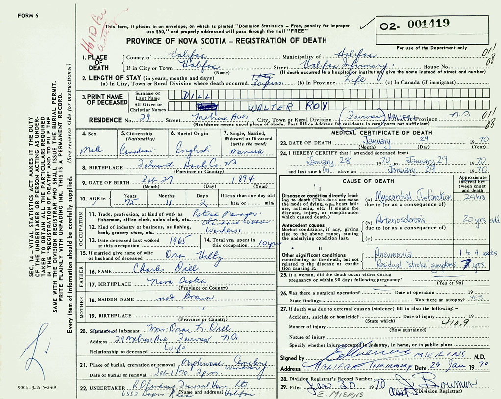 PROVINCE OF NOVA SCOTIA — REGISTRATION OF DEATH