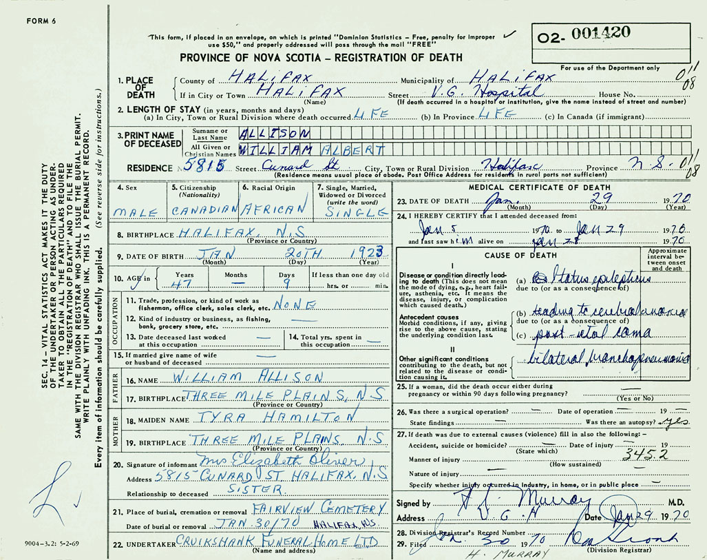 PROVINCE OF NOVA SCOTIA — REGISTRATION OF DEATH