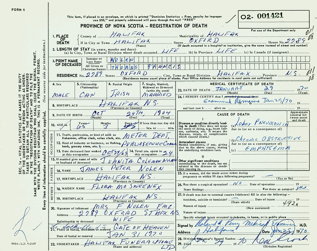 PROVINCE OF NOVA SCOTIA — REGISTRATION OF DEATH