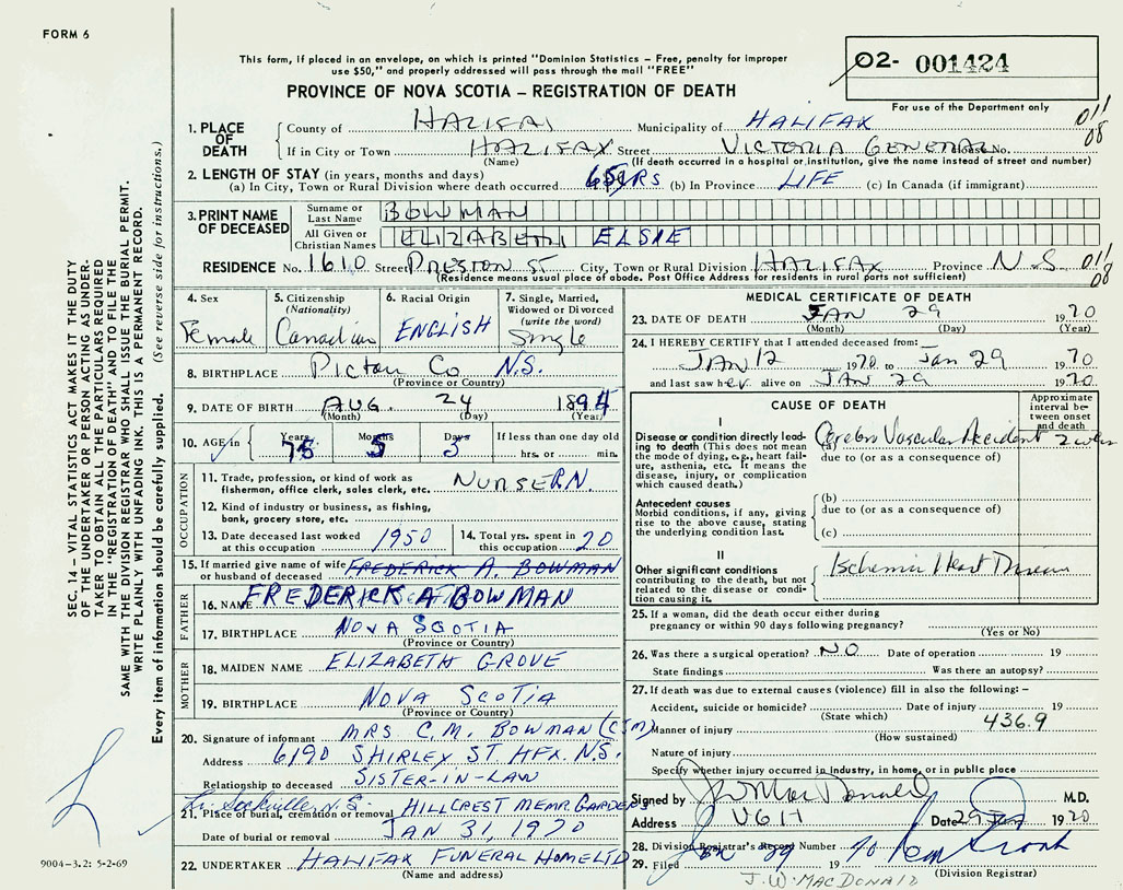 PROVINCE OF NOVA SCOTIA — REGISTRATION OF DEATH