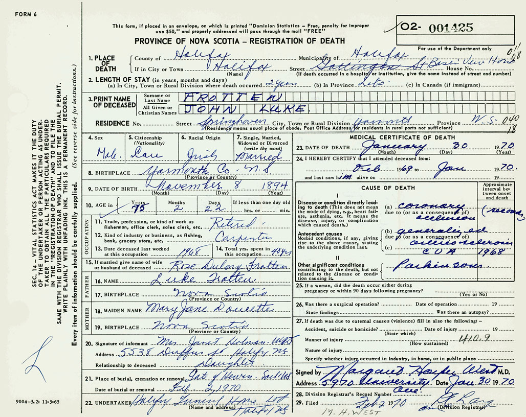 PROVINCE OF NOVA SCOTIA — REGISTRATION OF DEATH