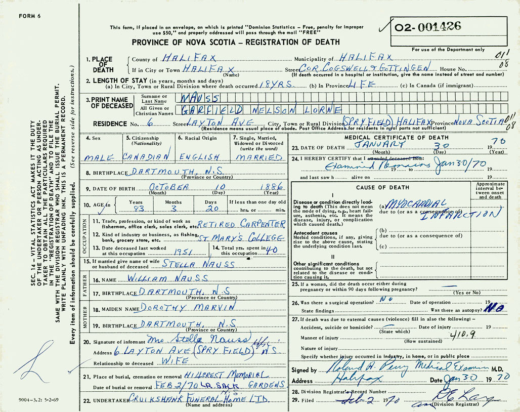 PROVINCE OF NOVA SCOTIA — REGISTRATION OF DEATH