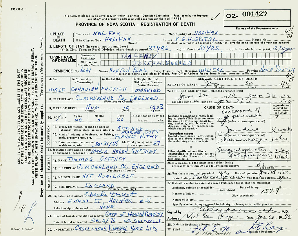 PROVINCE OF NOVA SCOTIA — REGISTRATION OF DEATH