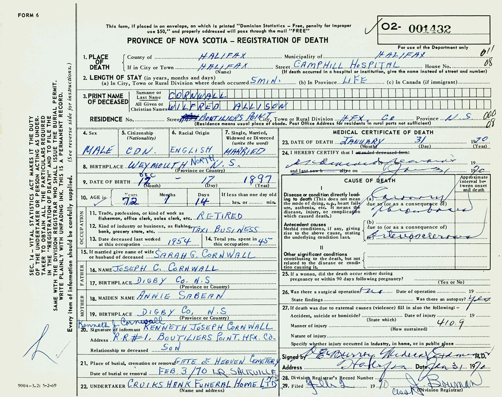 3. PRINT NAME OF DECEASED Cornwall, Wilfred Allison