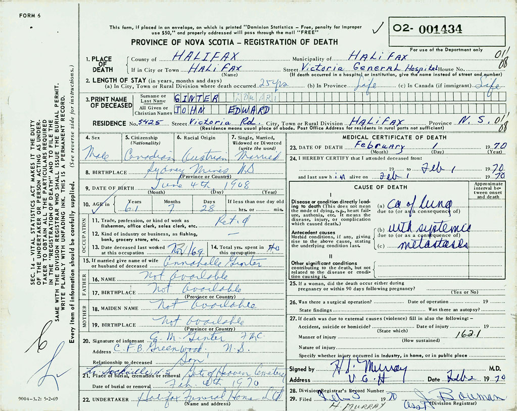 PROVINCE OF NOVA SCOTIA — REGISTRATION OF DEATH