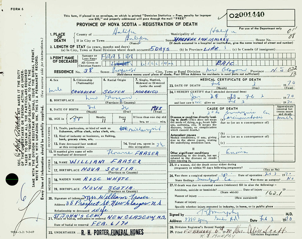 PROVINCE OF NOVA SCOTIA — REGISTRATION OF DEATH