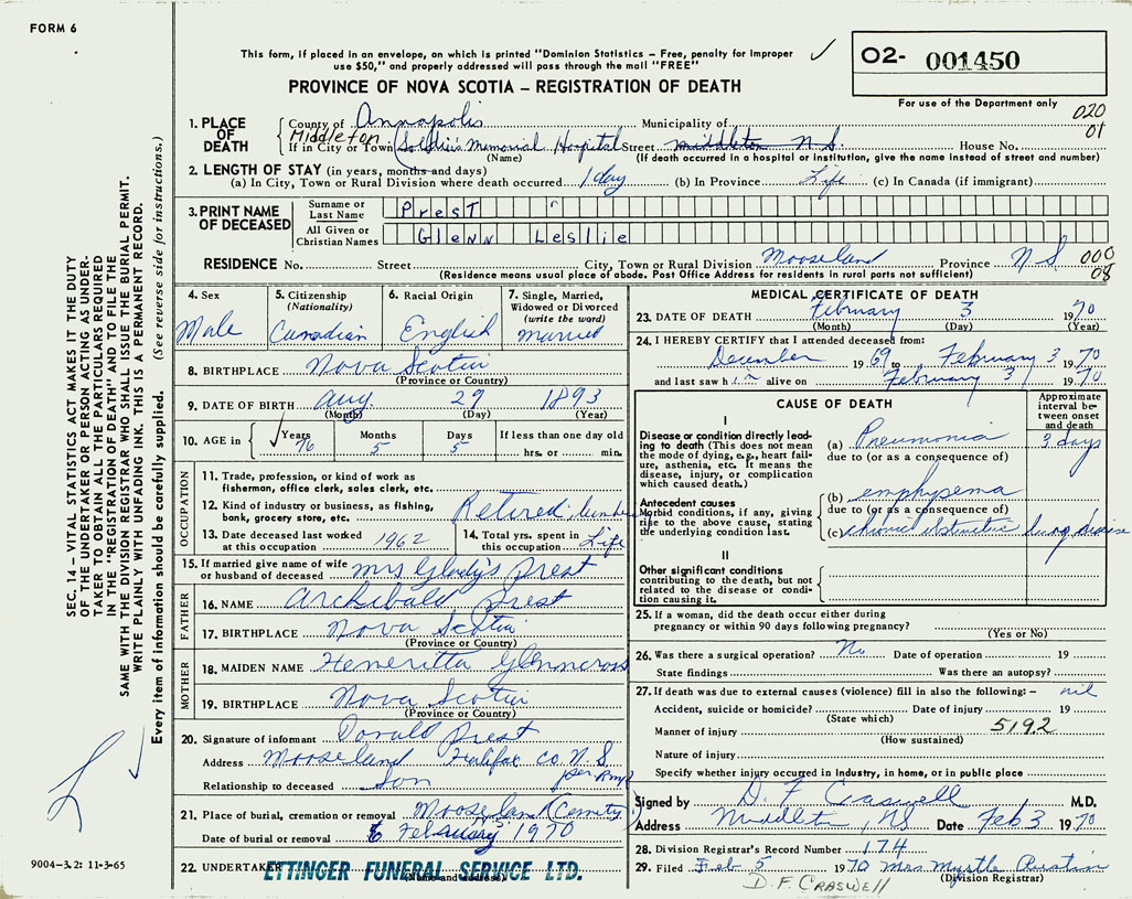PROVINCE OF NOVA SCOTIA — REGISTRATION OF DEATH