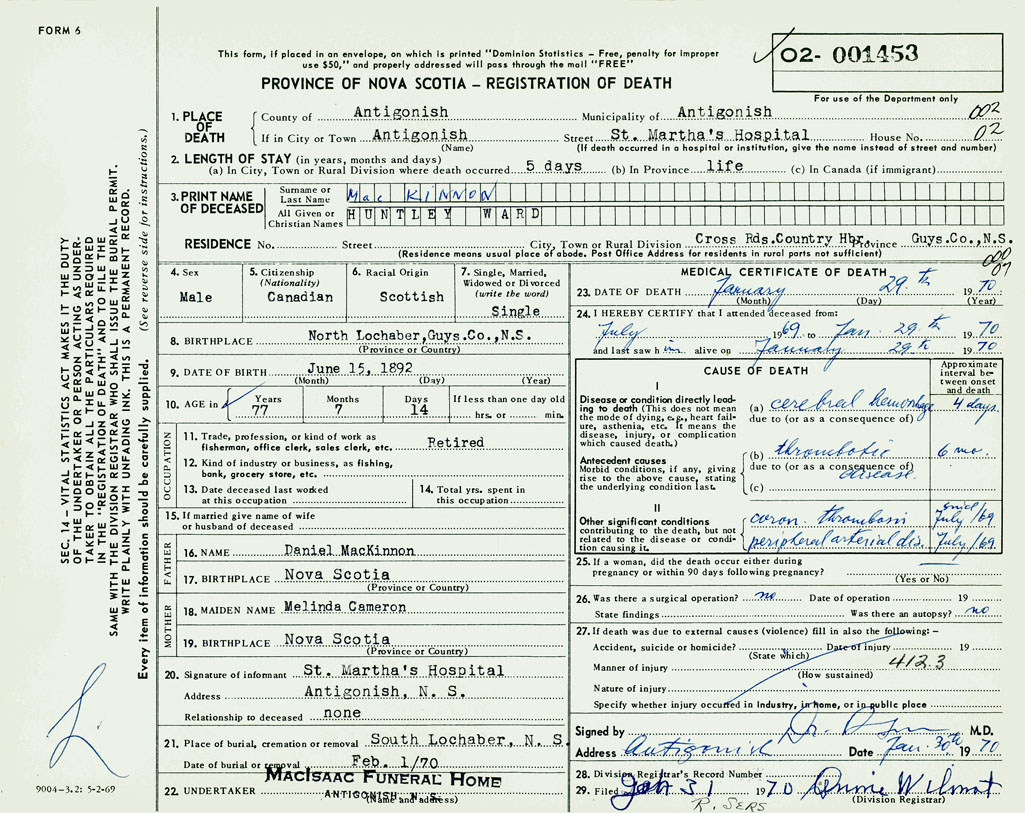 1. PLACE OF DEATH County of Antigonish If in City or Town Antigonish