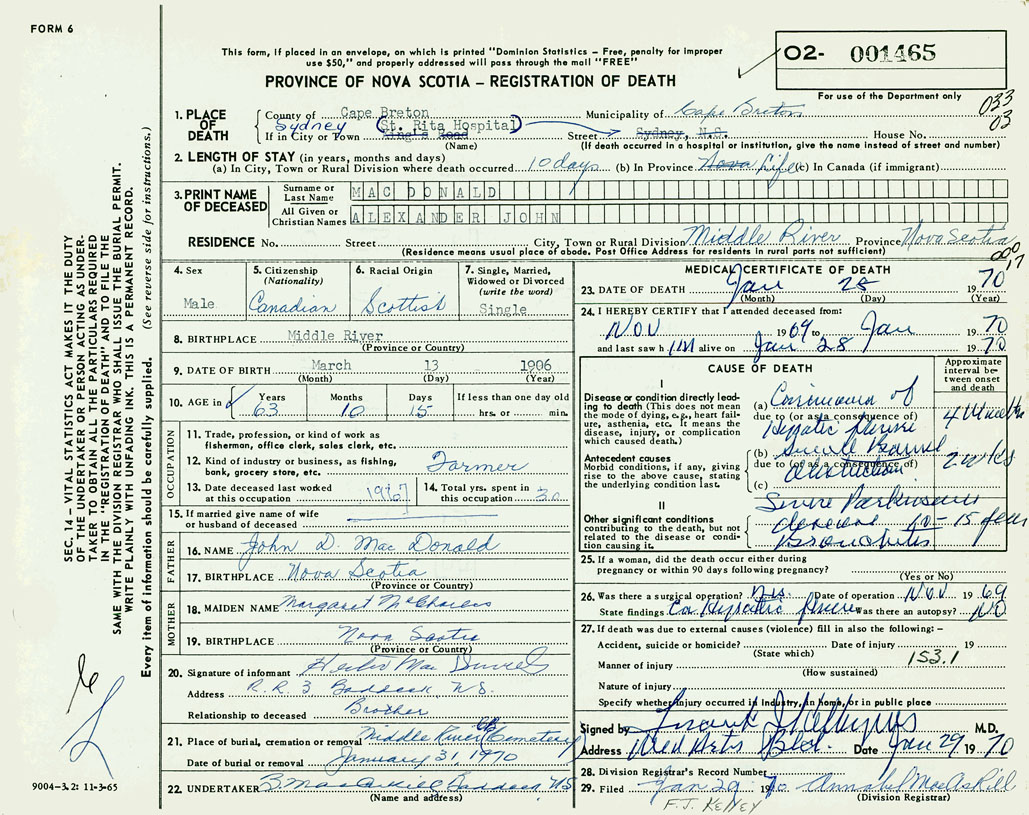 1. PLACE OF DEATH County of Cape Breton If in City or Town Sydney