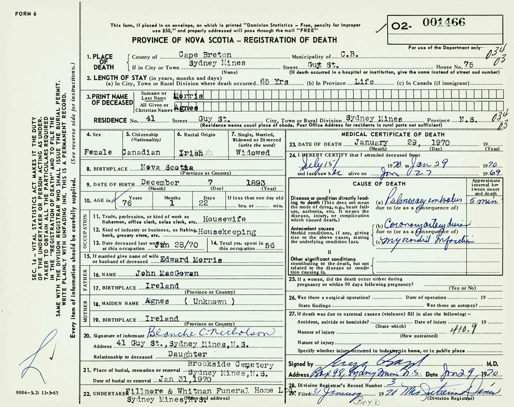 1. PLACE OF DEATH County of Cape Breton If in City or Town Sydney Mines